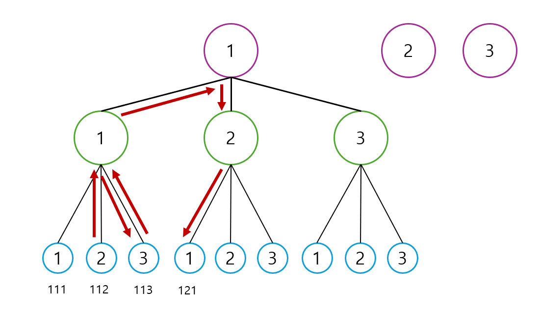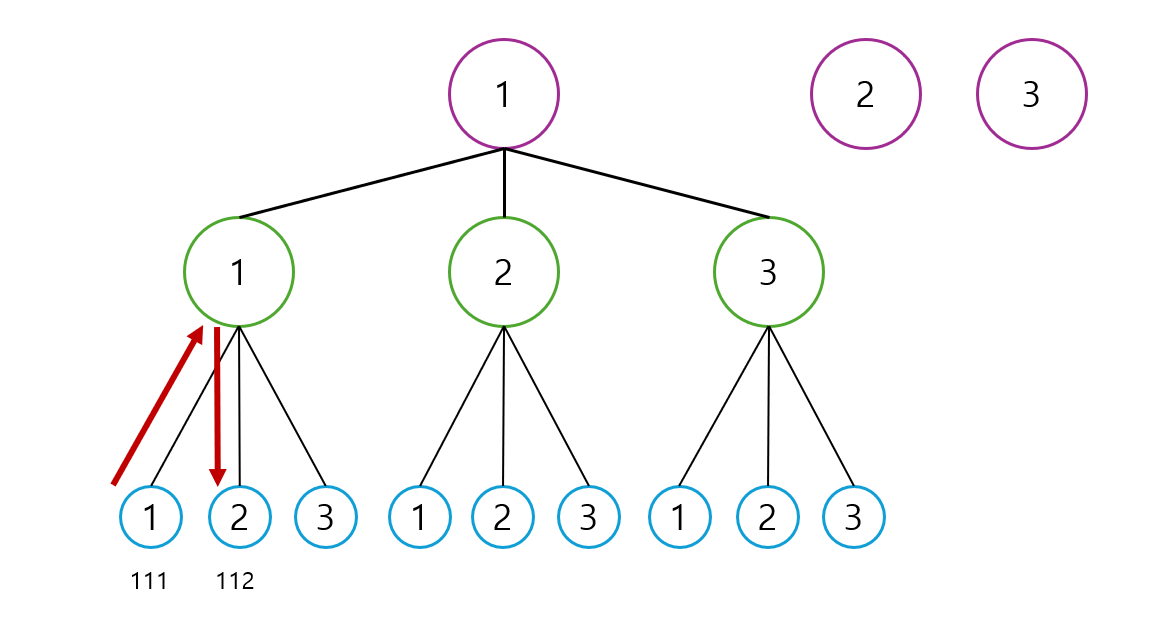 1-1-1로 트리의 끝에 도착했다면, 다시 1-1로 돌아가고(백 트래킹 하고) 이번에는 2를 선택합니다.