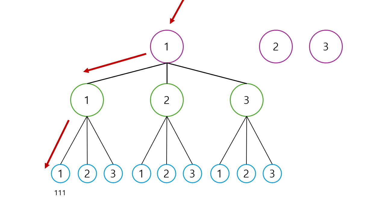 각 자리를 1, 2, 3 순서로 선택하며 내려간다고 하면, 가장 처음 도착하는 숫자는 1-1-1입니다.
