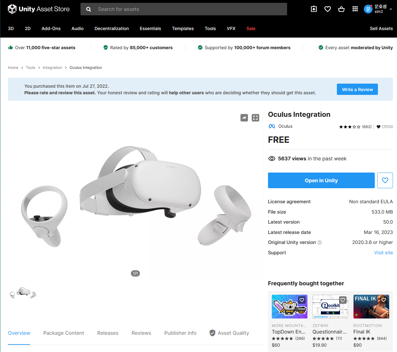 에셋스토어에 들어가 Unity Interation을 구입합니다.