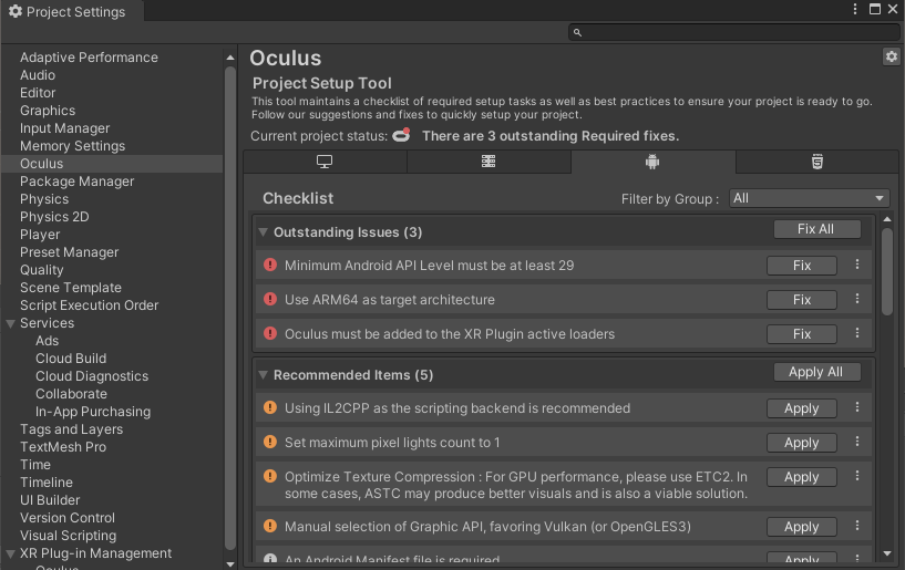 이후 다시 Project Settings에 들어가면 몇가지 문제가 존재한다고 하는데, Fix All과 Apply All을 누르면 자동으로 퀘스트2 개발에 맞는 설정으로 맞춰줍니다.