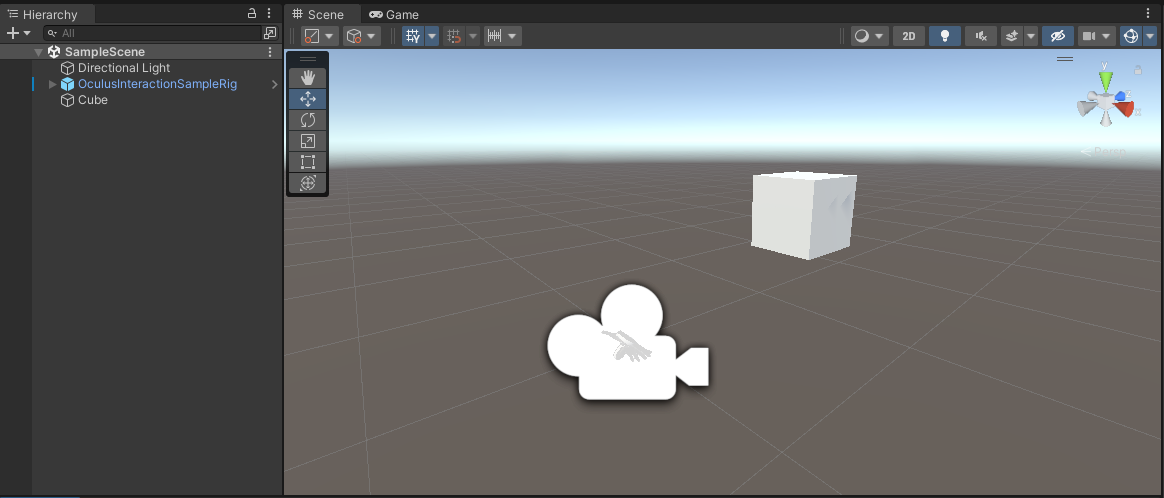 이제 설정이 끝났으니 에셋에서 OculusInteractionSampleRig를 프로젝트에 추가합니다. 이것이 퀘스트의 카메라 역할을 하므로 기본 카메라는 지우면 됩니다. 그리고 간단히 앞에 큐브를 추가합니다. 유니티에서 1유닛은 현실에 1m와 일치하니, 크기를 적당히 조절해 줍시다.