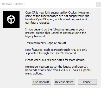 중간에 OpenXR을 사용할 것인지 물어보는데, 리프트를 대상으로 개발하고 있지 않으니 Use OpenXR을 누룹니다. 그 이외에도 최대한 업그레이드를 하고, 추천하는 대로 진행하면 됩니다.