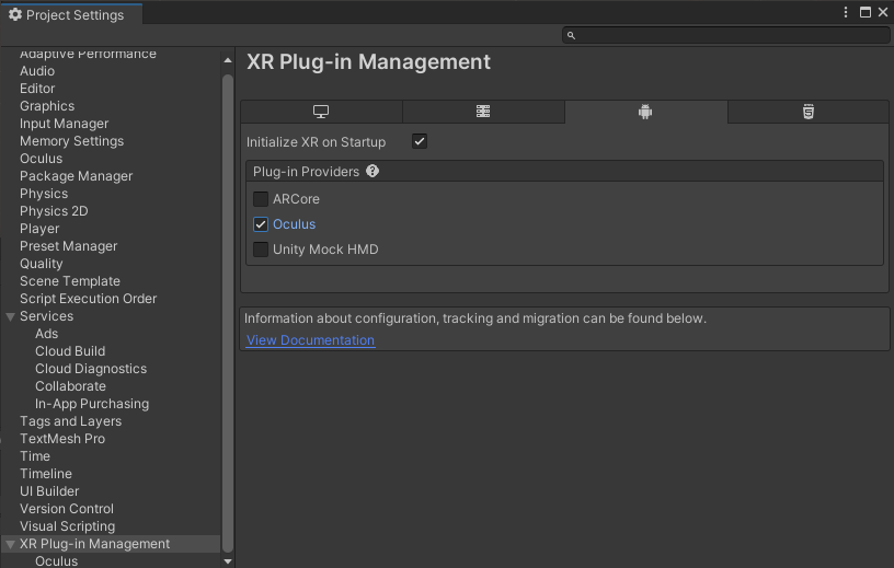 설치가 끝났으면 Project Settings 최하단에 XR Plug-in Management로 들어가 안드로이드와 Oculus를 선택해줍니다.