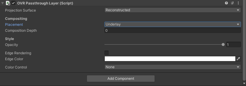 5. OVR Passthough Layer에 Compositing-Placement를 Underlay로 변경합니다. 이는 Passthrough 화면을 유니티 화면의 위에 그릴지 아래에 그릴지 정합니다. 만약 Overlay로 설정하면 Passthrough화면이 유니티를 덮어 다른 오브젝트가 보이지 않게 됩니다.