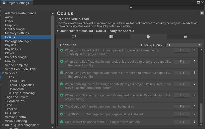 6. 마지막으로 Project Setttings-Oculus에 들어가 Passthrough를 위한 설정이 제대로 되었는지 확인합니다. 문제가 있을 경우 fix를 하면 됩니다.