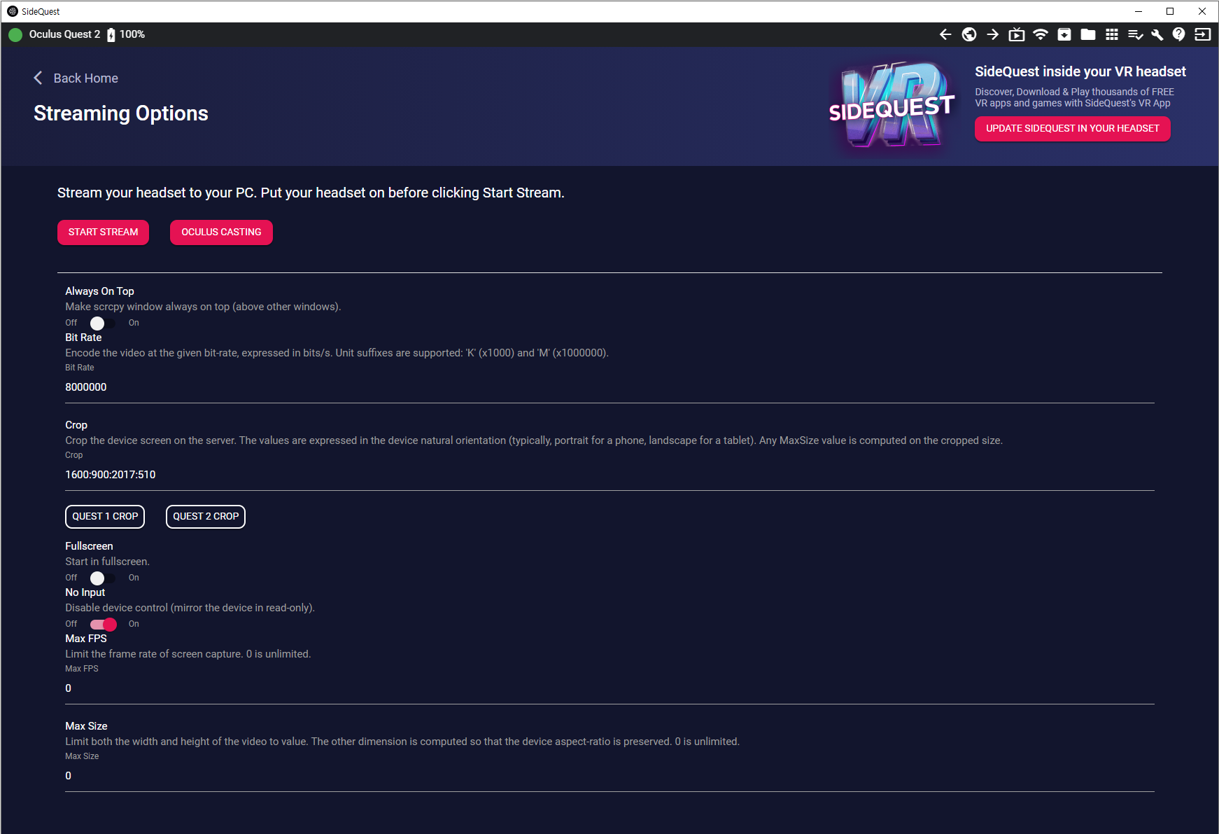 SideQuest를 실행하고 좌상단의 초록불이 들어오면 quest와 연결이 되었다는 뜻입니다. 우상단의 TV모양 아이콘을 누르고, Quest2 Crop을 누른 뒤, 퀘스트가 활성화된 상태에서 Start Stream을 누르면 퀘스트 화면이 그대로 출력되는 걸 볼 수 있습니다.