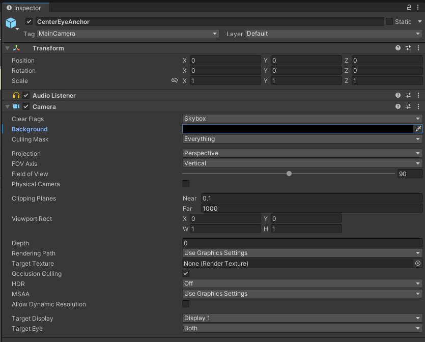 5. 다음으로 카메라의 뒷 배경을 투명하게 하기위해 OVRCameraRig하부에 CenterEyeAnchor의 Background 색을 검정색, 투명으로 바꿉니다. 이를 반투명으로 할 경우 Passthrough의 색에 영향을 줍니다.