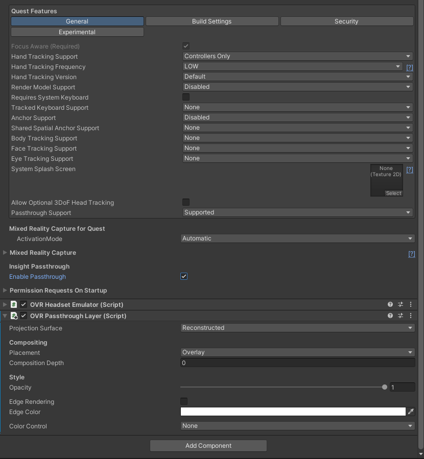 2. Quest Features에 Passthrough Support를 Supported로 변경합니다.